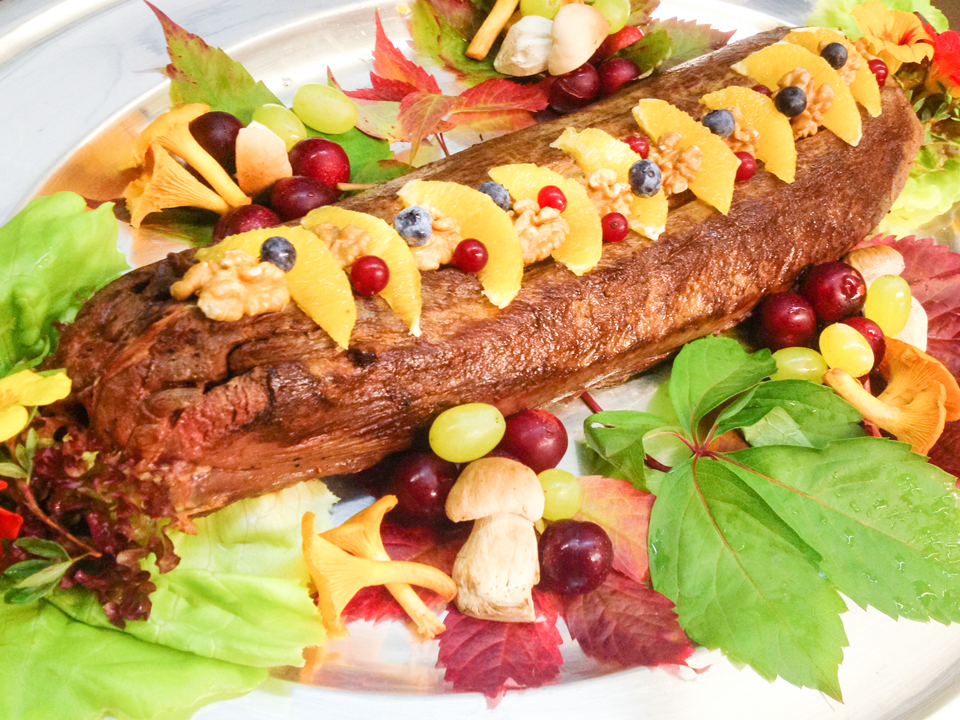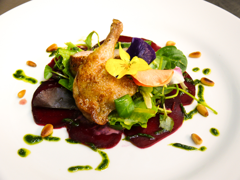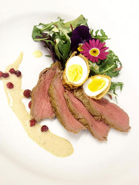 Rosa Rehrücken mit Wildkräutersalat und Wachtelei