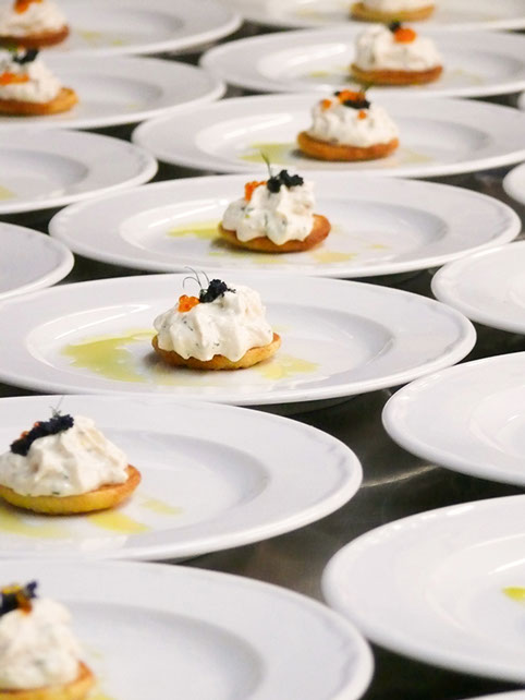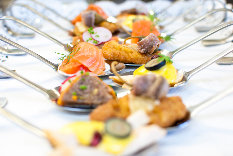 Fingerfood auf Löffeln u.a. mit Lachs, Tafelspitzsülze