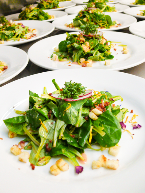 Voger'lsalat mit Speckwürfeln und Croûtons