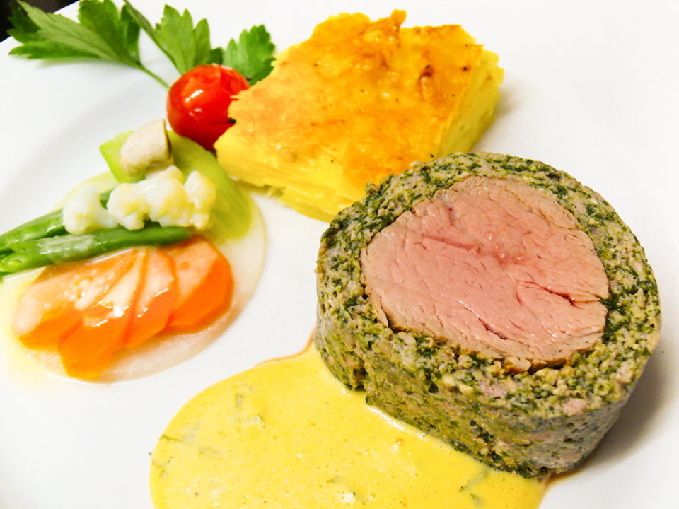 Kalbsfilet im Kräutermantel mit Kartoffelgratin und Gemüse